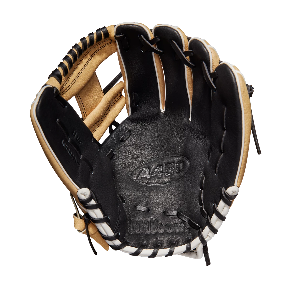 Perfect your infield fundamentals with the 2022 A450® 11.5 in. Infield Glove. The Black and Blonde design with our iconic H-Web is lightweight and game ready.