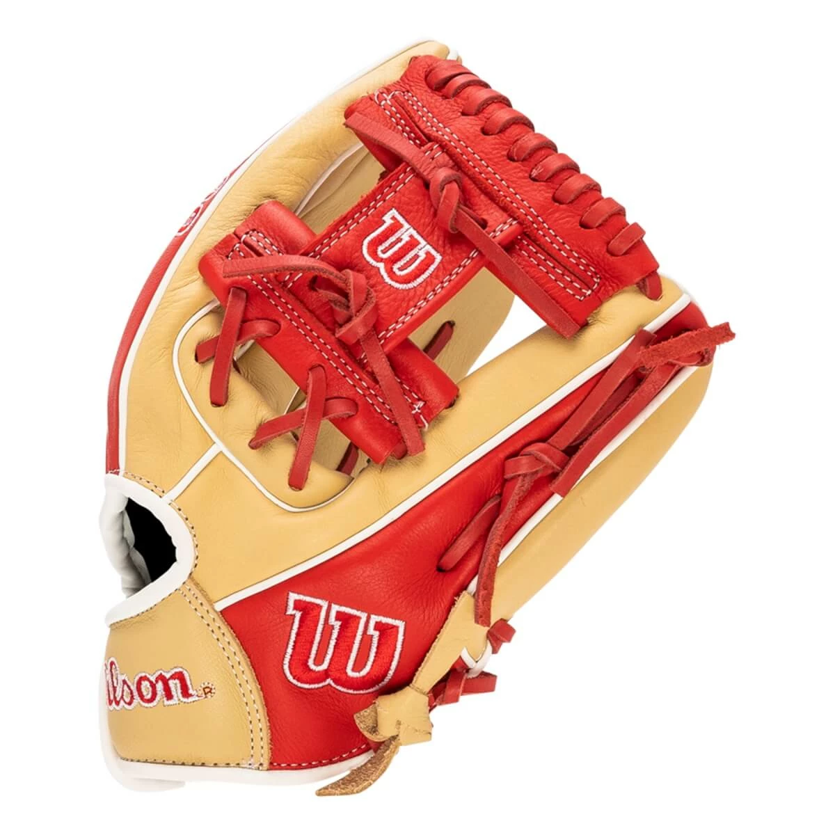 “The 11 in. A500, featuring Wilson’s iconic H-Web to corral the ball, is ideal for youth ballplayers who play all over the diamond. The all-leather construction offers a durable and lightweight feel with Blonde and Red Top Grain leather, White binding and dual welting. Engineered for youth players, the A500 boasts a Quick Fit Wrist elastic system that adjusts to hug the wrist, and finger stalls are short and narrow for a steady control of the glove.”